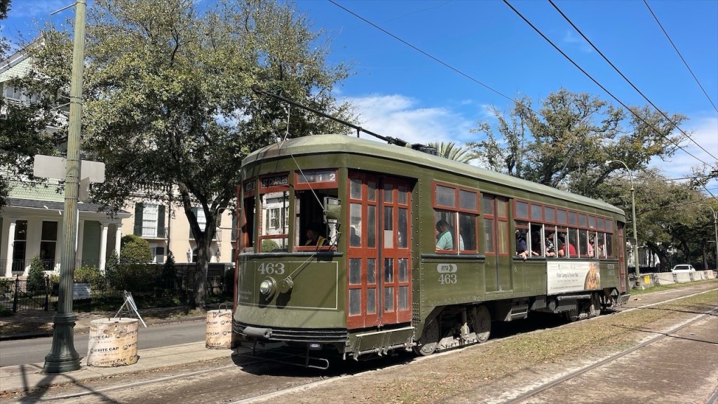 Zu Fuß schlenderten wir die Jackson Avenue hinauf, bis wir die Kreuzung Saint Charles Avenue / First Street erreichten. Dort fährt sie noch: die historische Straßenbahn – eine der ältesten, durchgehend betriebenen Straßenbahnlinien der Welt. Die grünen Waggons rattern gemächlich vorbei, fast wie aus einem Film.