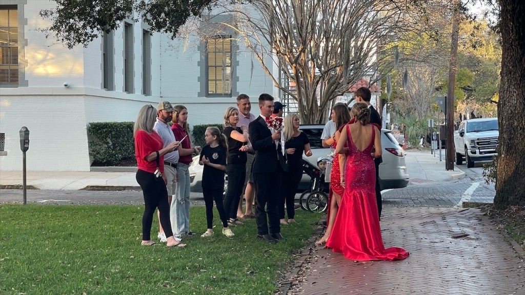 Schülerinnen tragen elegante Abendkleider, Schüler erscheinen im Anzug oder Smoking. Vor dem Ball treffen sich viele Gruppen in Parks oder an schönen Orten der Stadt, um Fotos zu machen.
