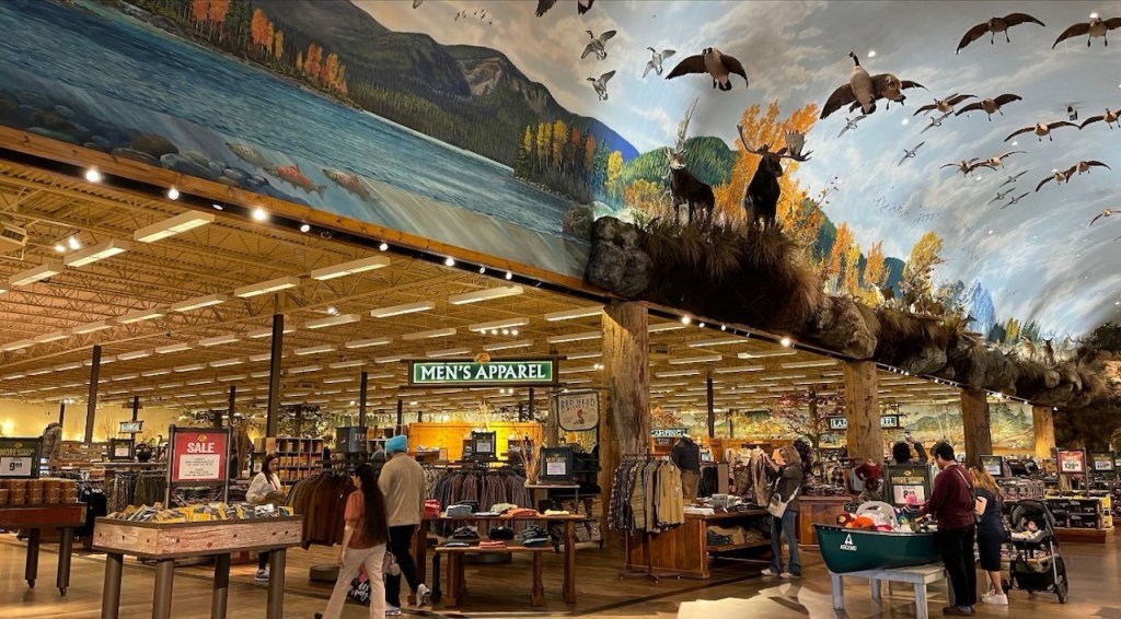 eine Mischung aus Outdoor-Supermarkt, Jagd- und Angelshop, Erlebniswelt und Museum. Viele Filialen sehen eher aus wie Freizeitparks – mit Aquarien, ausgestellten Booten oder sogar kleinen Wasserfällen.