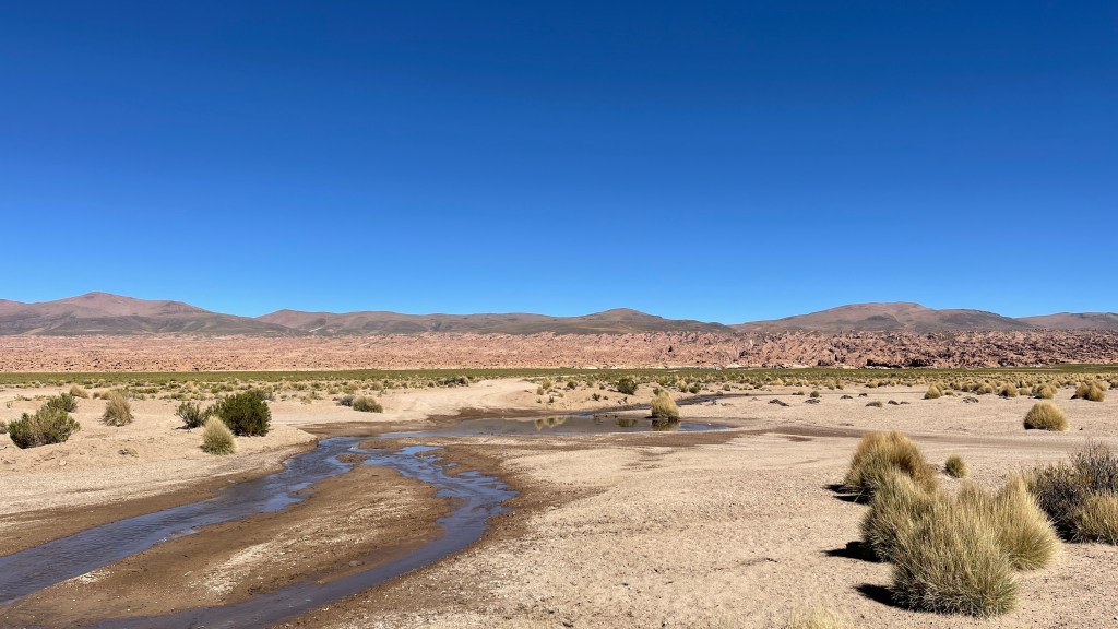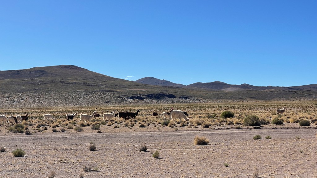 Am Mittwochvormittag ging es über die glücklicherweise spiegelglatte, da gut asphaltierte, „Ruta 5“ weiter bis nach „Potosí“. Die 120 km lange Fahrt gestaltete sich sehr kurzweilig da wir, ähnlich wie zuvor in Argentinien, das Gefühl hatten als würde sich die Landschaft ständig verändern. Es ging über grasbewachsene Bergketten, vorbei an tiefen Canyons und ausgetrockneten Flussläufen bis plötzlich Säulenkakteen und niedrige Bäume auftauchten. Gegen 15 Uhr erreichten wir dann die Bergbaustadt „Potosí“ und wir staunten nicht schlecht über die mitunter extrem steilen und vor allem engen Gassen. Ich hatte schon Sorge, dass wir irgendwo stecken bleiben würden aber glücklicherweise kamen wir dann doch noch ohne Panne an einem der zentrumsnahen Bezahlparkplätze an. 🙈 Wir quetschten uns durch das gleichfalls recht schmale, aber zumindest hohe Einfahrtstor und fanden im hinteren Bereich einen guten Stellplatz für unseren Van. Für 45 BS (= 6 €) konnten wir dort 24h parken und sogar im Bus übernachten. 👍 Von dort aus waren es zu Fuß nur wenige Minuten bis zur gerade einmal zwei Quadrate entfernt liegenden Plaza, welche zu unserer Überraschung tatsächlich sehr hübsch war. Die umliegenden Gebäude stammten alle noch aus der Kolonialzeit weswegen die Fassaden mitunter sehr üppig verziert waren. Auch die Kathedrale sowie die Plaza selbst mit ihren maurischen Bögen und den Springbrunnen überzeugte. Wir schlenderten durch die engen Gässchen und buchten bei „Koala Tours“ für 130 BS pro Kopf (= 17 €) für den kommenden Morgen eine geführte Tour durch die Minen des „Cerro Rico“. Laut eigenen Angaben des Tour-Anbieters wird ein Teil der Einnahmen bei der jährlichen Weihnachtslotterie an die Bergleute gespendet. Und da man in Bolivien einfach so unglaublich günstig und noch dazu gut essen kann, blieb unsere Küche am Abend erneut kalt. 😂 In einem der zahlreichen Lokale aßen wir je eine große Portion „Aji de Fideos“. Hierbei handelte es sich um eine große Schüssel voll ziemlich pikanter Nudeln mit einem dünnen Stück Rindfleisch on top. @Norbert Kröner: Bolivien wäre essenstechnisch DEIN Land – hier ist alles nah an der Grenze zu scharf. 😛