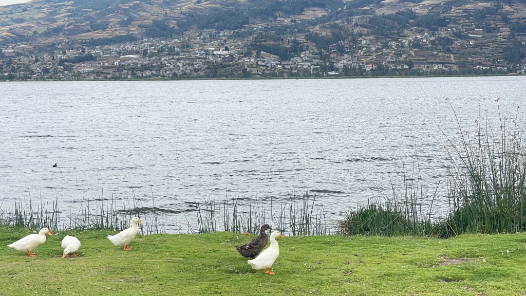 Relativ früh am nächsten Morgen verlies eine größere Reisegruppe das Hotel und ich witterte die Chance, doch noch zu einer warmen Dusche zu kommen. Ich erkundigte mich an der Hotelrezeption ob es eventuell möglich wäre, in einem der noch nicht gereinigten Zimmer das Bad zu nutzen da die Außendusche so extrem kalt sei, insbesondere zum Haare waschen. Der junge Mann, dem ich die Frage stellte, hatte seinem Gesichtsausdruck nach sofort vollstes Verständnis für mein Anliegen und hätte es mir sicherlich postwendend erlaubt. Schade nur, dass er offensichtlich nichts zu melden hatte und mir kurz darauf, mit sichtlich bedauernder Miene, mitteilte dass die Hotelpolitik dies nicht gestatten würde. Leicht verärgert machte ich mich auf den Rückweg zum Van denn wie gesagt, für einen Parkplatz und eine Toilette hätten wir keine 10$ ausgeben müssen! Noch auf halbem Wege kam ein anderer Hotelangestellter zu mir geeilt und bot mir an, die warme Dusche in seinem Zimmer zu nutzen. Einen Moment lang war ich wirklich sprachlos. Wie nett die Menschen in Ecuador doch sind! 🥰 Nach dem er mir versichert hatte, dass er deswegen keinerlei Schwierigkeiten bekommen würde, nahm ich sein Angebot dankend an und seine Dusche war sogar richtiggehend heiß. Auch Simon durfte sich in seinem Bad noch frisch machen bevor wir uns an den Upload des fertiggestellten Videos machten. Gegen Mittag verließen wir „Mindo“ und auf unserem Weg nach „Otavalo“ fuhren wir noch einmal am Äquatordenkmal vorbei. Da unsere frischen Vorräte mittlerweile stark abgenommen hatten füllten wir diese am Stadtrand von Quito in einem Supermarkt auf und kauften beim Bäcker gegenüber noch einen kleinen Snack für den Nachmittag. Am frühen Abend erreichten wir dann den schönen „Lago San Pablo“ am Fuße eines grünen Vulkans, nur wenige Kilometer außerhalb des Zentrums von „Otavalo“. Dort trafen wir auf Thomas und Isabella (?), ein Paar aus Zürich dass seit dem Jahr 2016 mit ihrem MAN auf Reisen ist. 😮 Ich schätze die zwei auf Anfang 60 und ich glaube, sie waren mit ihrem LKW mit Wohnkabine bereits auf jedem Kontinent. Sie haben es sogar geschafft ihr Fahrzeug von Indien aus nach Neuseeland und Australien zu verschiffen was wir bis dato, auf Grund der super strengen Hygiene- und Einfuhrregeln in den beiden Ländern, für fast unmöglich gehalten hatten. Nach dem kurzen Plausch mit den beiden liefen wir noch ein Stück am Ufer entlang und schauten eine Weile den vielen Reihern zu bevor es auch schon wieder Zeit fürs Abendessen wurde. 👩🍳