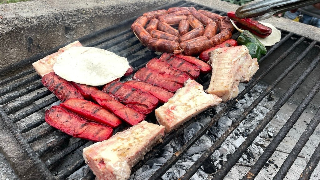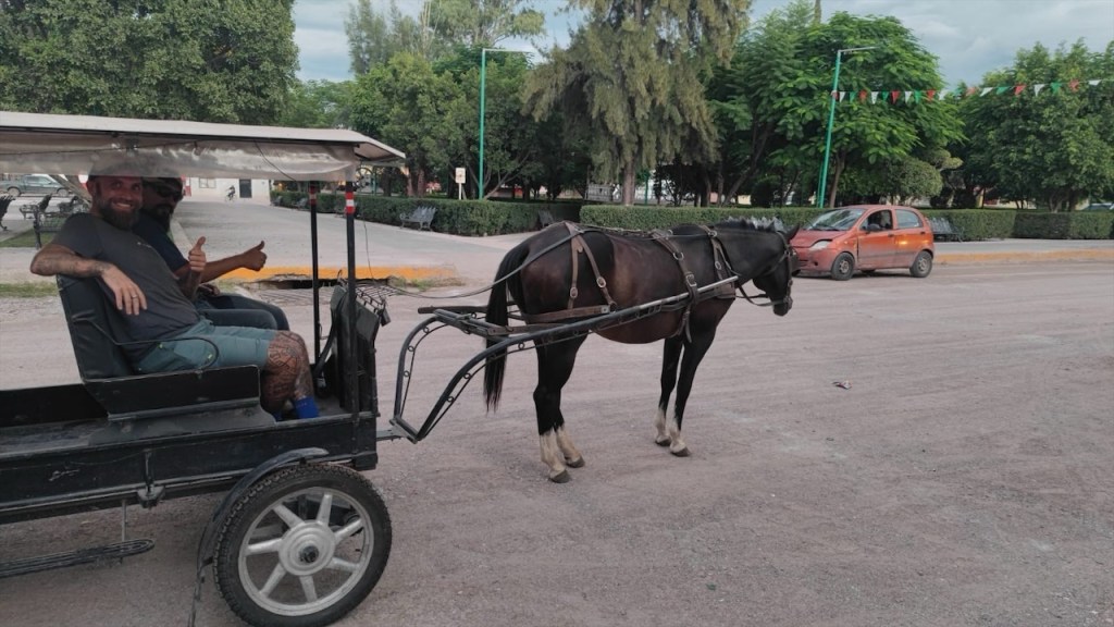 Wenige Minuten nach unserer Ankunft auf dem gepflegten Campground war klar: Hier würde es spannend werden! Kaum hatten wir uns eingerichtet, tauchten vier Freunde des Besitzers Javier mit einer Pferdekutsche auf. Was wie ein kurzer Plausch begann, entwickelte sich innerhalb kürzester Zeit zu einer ausgewachsenen Fiesta, wie man sie sich in Mexiko vorstellt. Kommt dazu!, forderte uns Javier auf, und ehe ich mich versah hielt ich schon ein eiskaltes Corona in der Hand – Simon, wie immer alkoholfrei, schaute schmunzelnd zu. Während wir nett plauderten, verabschiedete sich plötzlich einer der Männer, sprang auf ein Motorrad und düste davon. Etwa eine halbe Stunde später tauchte er, wie ein Held der Feier, wieder auf – und zwar schwer bepackt: Grillkohle und noch mehr Bier. Aber das war noch nicht alles! Kurz darauf erschien der Dorfmetzger, ein Freund der Runde, mit einer riesigen Tüte voller selbst gemachter Würstchen und hauchdünnen Rib-Eye-Steaks. 🌭🍺