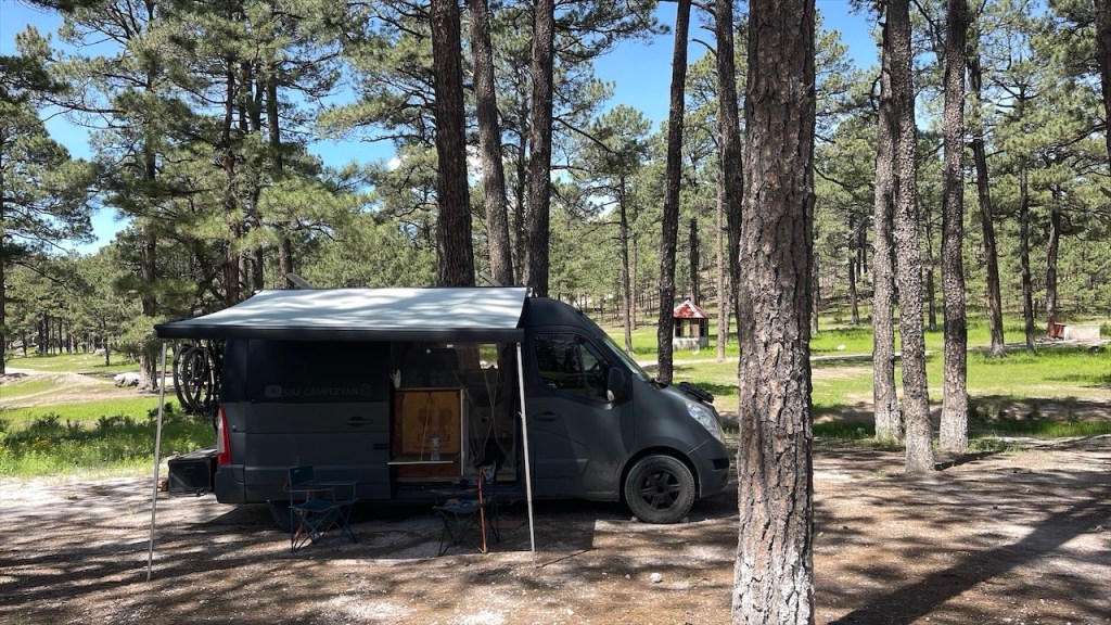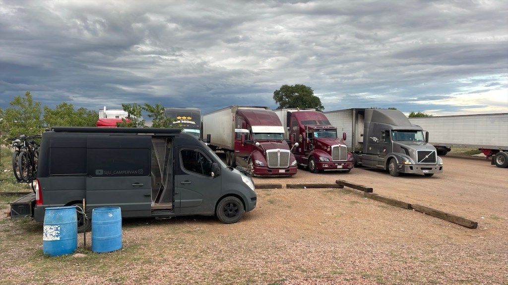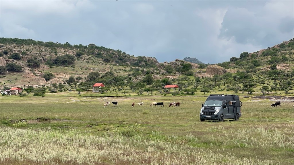Am Mittag machten wir uns auf den Rückweg in die Großstadt Cuauhtémoc, vorbei an Creel, der Endstation des El Chepe Train. Kaum hatten wir uns wieder auf den Weg durch die von Holzwirtschaft und die Anwesenheit der Tarahumara geprägte Landschaft gemacht, zog der Himmel erneut zu und dicke Tropfen begannen vom Himmel zu fallen. 💧 Es gelang uns gerade noch rechtzeitig die nötigen organisatorischen Dinge, wie beispielsweise Brauchwasser auffüllen und das Port-A-Potti leeren, zu erledigen.