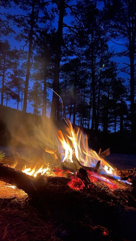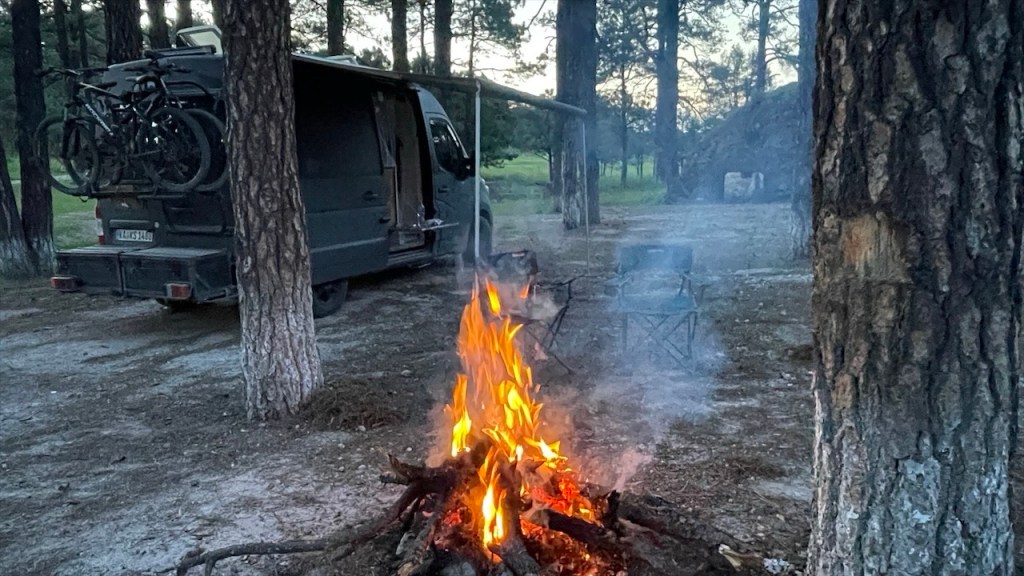 Als die Temperaturen am Abend wieder merklich sanken, zündeten wir ein kleines Lagerfeuer an das wir aus gesammelten Kiefernästen zusammenstellten. 🔥 Auch wenn die Zweige nicht besonders gut brannten so reichte es doch für ein bis zwei Stunden Lagerfeuer-Romantik aus. Während die Glut vor sich hin prasselte, hielten wir ein paar Marshmallows über die Flammen und genossen den fantastischen Sternenhimmel, der über uns funkelte. 🌟