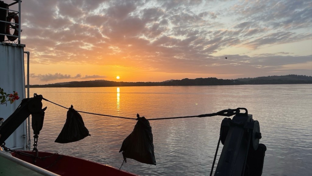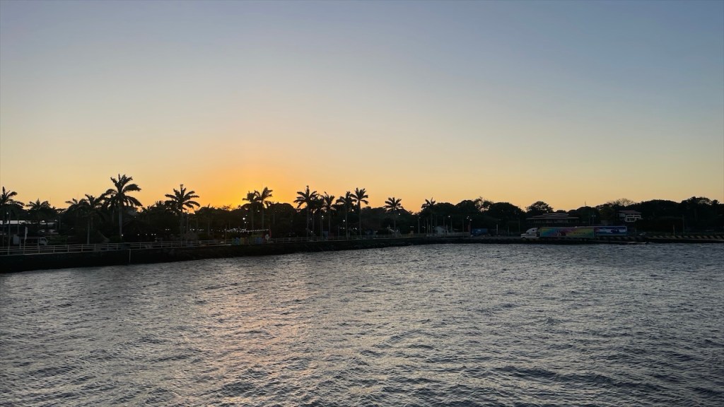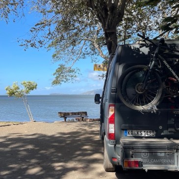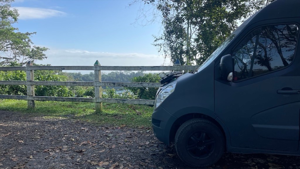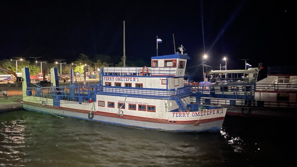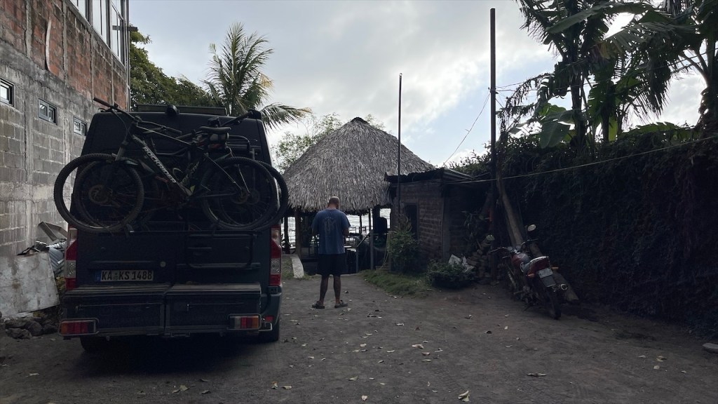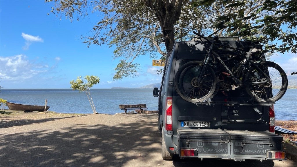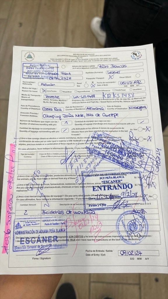 Wir wurden im Morgengrauen, schätzungsweise gegen 05:00 Uhr, von den Brüllaffen sowie dem krähenden Hahn geweckt. Simon versuchte noch einmal kurz sein Angelglück, diesmal allerdings erfolglos, während ich früh am Morgen noch eine Runde Yoga absolvierte. Danach versteckten wir unsere Drohne sowie die Festplatten und das Fernglas gut im Innenraum, da diese Gegenstände in Nicaragua nicht nur ungern gesehen, sondern mitunter sogar verboten sind. Nach dem Frühstück verabschiedeten wir uns von Agi, beglichen bei ihr die 15$ für die Übernachtung auf dem Campingplatz sowie weitere 5$ für die Waschmaschine. Vor Verlassen des Geländes nutzten wir noch das gute WLAN, um die 8$ Touristensteuer zu bezahlen, die bei Ausreise aus dem Land fällig werden. Über die Website der Banco Costa Rica, kurz BCR, ging das zum Glück relativ einfach und zügig. Vor der Grenze hatte sich bereits ein ca. fünf Kilometer langer LKW-Stau gebildet aber unsere Ausreise aus Costa Rica war binnen fünf Minuten erledigt. 👍 Auf dem Weg zur nicaraguanischen Grenze mussten wir mit dem Van die obligatorische Fumigación (=Fahrzeugdesinfektion) passieren. Beim Betreten der Migración in Nicaragua staunten wir nicht schlecht denn kurioserweise werden hier pro Person 1$ Eintritt ins Gebäude verlangt. 😮 Wir behaupteten, weder US-Dollar noch nicaraguanische Cordoba zu besitzen. Und da sie den 10k Colon Schein aus Costa Rica nicht wechseln konnten kamen wir letzten Endes doch noch ohne Gebühr rein. 😉 Auch die Stempel in den Pass kosteten pro Kopf 13$. Weiter gings zur Aduana, wo sich die Zöllner gegen eine manuelle Durchsuchung unseres Fahrzeugs und für den elektronischen Scanner entschieden. Mit unserer ausgefüllten Einreisekarte mussten wir zur Polizei, diese dort abgeben, anschließend mit dem Fahrzeug durch die Röntgenanlage und dann wieder zurück zur Polizei. Dort mussten wir länger warten, bis letztlich Beamte mit dem Röntgenbild erschienen und noch einen Blick in den Innenraum warfen. Ihre Fragen nach Drohne, Walkie-Talkie und GPS-Gerät verneinten wir jeweils. Daraufhin erhielten wir die Einreisekarte, die zwischenzeitlich mit diversen Stempeln und Unterschriften versehen war, wieder zurück und gingen damit neuerdings zur Aduana wo wir das TIP fürs Fahrzeug erhielten. Am nächsten Schalter wurden wir erneut zur Kasse gebeten: Für die Fahrzeugdesinfektion wurden 5$ verlangt. Außerdem mussten wir weitere 5$ KFZ-Steuer bezahlen. Bis dato hatten wir noch an keiner einzigen Grenze irgendetwas bezahlen müssen. 😮 Es folgte ein letzter Dokumentencheck beim finalen Passieren der Grenze, wo wir rechter Hand an einem Imbissstand bei einer Versicherungsdame gegen Zahlung weiterer 12$, die KFZ-Haftpflichtversicherung für die gewährten 30 Tage abschließen konnten. Weder die Quittung für die Ausreisesteuer aus Costa Rica, noch die Belege für Fahrzeugdesinfektion bzw. KFZ-Steuer in Nicaragua wurden irgendwo kontrolliert. Vielleicht hätte man sich diese Kosten auch sparen können, aber wer will sich schon mit einer strengen Diktatur anlegen?! Insgesamt haben wir für den Grenzübertritt drei Stunden benötigt, unser bisheriges all-time high. Von der Grenze aus fuhren wir gegen 13:30 Uhr direkt weiter ins 35km entfernt gelegene Rivas, wo wir uns in einem Maxi Palí mit frischen Lebensmittel eindeckten. Von dort aus war es nur noch ein Katzensprung nach San Jorge, von wo aus die Autofähren auf die Ometepe Insel ablegen. Am Fährableger angelangt fragte uns der Hafenarbeiter nach einer Reservierung, die wir natürlich nicht hatten, woraufhin er meinte dass sowohl alle heutigen als auch morgigen Fähren bereits ausgebucht wären. 😮 Nichts desto trotz Begleitete er mich zu den drei Ticketschaltern und, wer hätte das gedacht: Die Dame an Schalter Numero Zwei hatte tatsächlich noch einen Platz auf der 17:45 Fähre für uns frei! In Summe kostete die Überfahrt für uns beide, den Van und die Fahrräder 30€. Hatte ich schon erwähnt, dass wir zuvor noch für 113€ tanken waren und der Einkauf im Supermarkt auch 52€ gekostet hatte? Zum Glück sind Tage wie dieser die Ausnahme! 💸💸💸 Die 70minütige Überfahrt nach Moyogalpa war auf Grund der starken Winde ziemlich rau und ich war Gott froh, dass mir trotz des heftigen Wellengangs nicht übel wurde. In der Dunkelheit bahnten wir uns unseren Weg durch enge Gassen zum wenige hundert Meter vom Fähranleger gelegenen Camping Doña Nela. Dort angekommen stellte sich allerdings heraus, dass wir mit unserem Van nicht durch das schmale Eingangstor hindurchkommen würden. Derzeit kann der Platz nur von Fahrrad- und Motorradreisenden genutzt werden. Sie versicherte uns jedoch, dass wir ohne Sorge am Straßenrand gegenüber von ihrem Grundstück die Nacht verbringen könnten. Die gesamte Insel sei sehr sicher und es würden mit Sicherheit auch keine weiteren größeren Fahrzeuge hier durchkommen. 🙈 Mangels Alternativen und müde von dem anstrengenden Tag willigten wir in ihren Vorschlag ein.