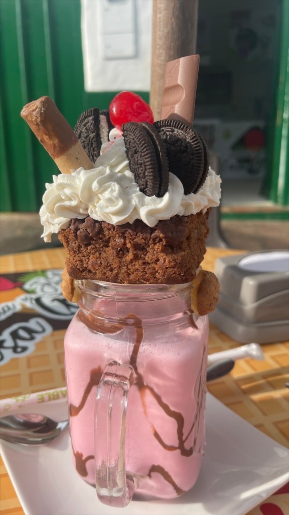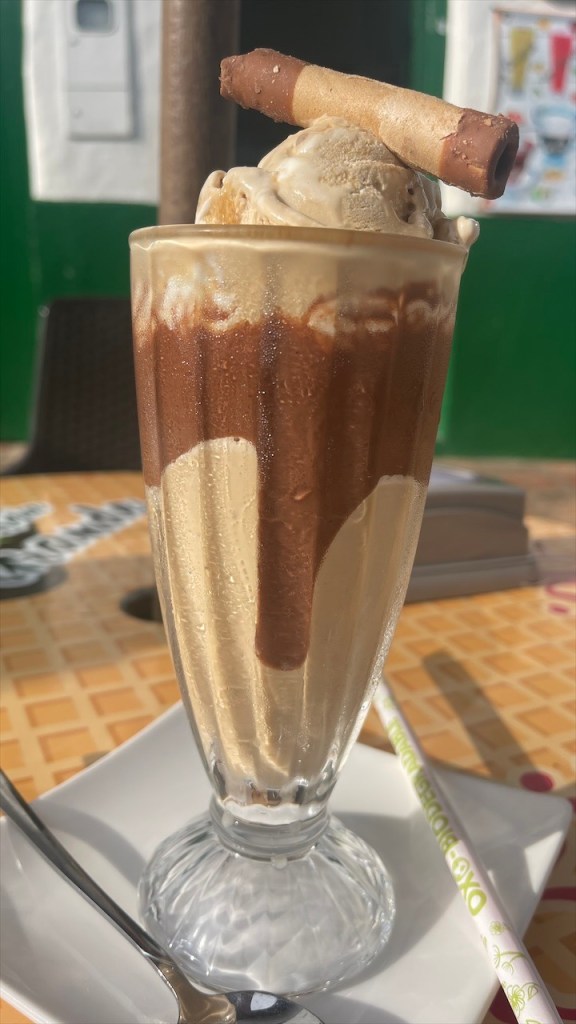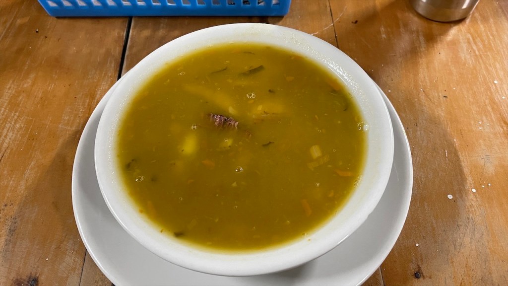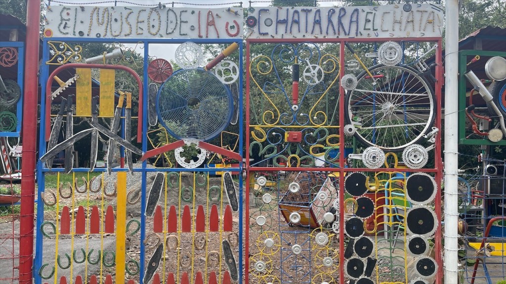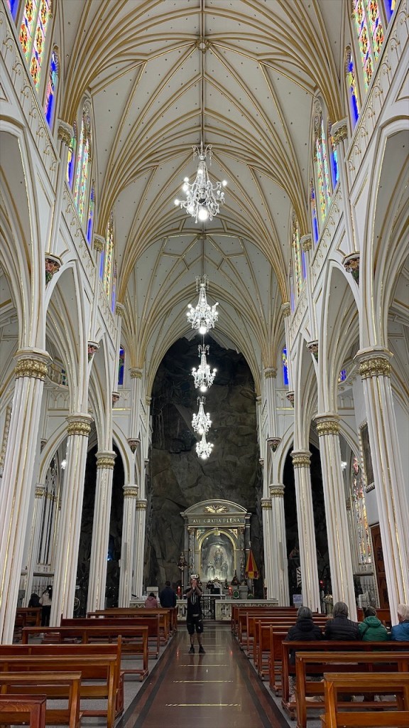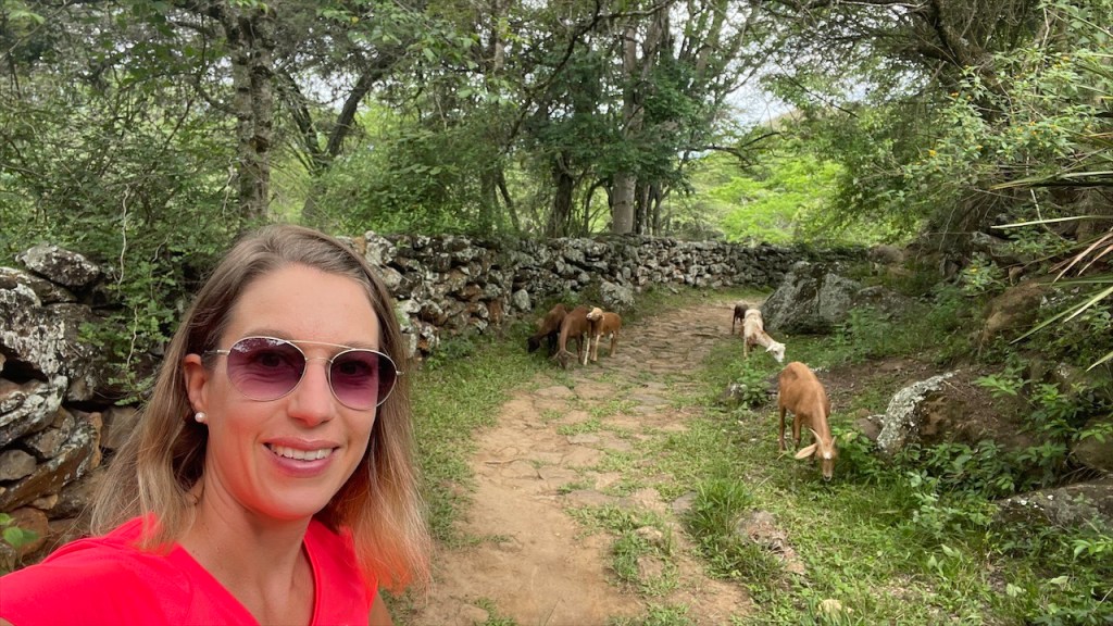 Die Wanderung hatten wir uns aber sowieso für den nächsten Tag aufgehoben. Wir waren gerade im Begriff den Van zu verlassen, als uns ein älteres kolumbianisches Geschwisterpaar ansprach. Ob wir denn nicht Lust hätten, uns eines der hier typischen Häuser von innen anzusehen? Aber klar doch! 😀 Also liefen wir, statt aus dem Ort hinaus, erstmal in diesen hinein. Wilson und seine Schwester Nubia kommen eigentlich aus der Nähe von Bogotá, verbringen aber schon seit 30 Jahren ihre Ferien in La Playa de Belén. Und da sie mittlerweile pensioniert sind leben sie aktuell von November bis Februar hier in den kühleren Bergen. Um die Weihnachtszeit herum findet sich dann die ganze Familie in ihrem großen Haus ein. Mit Kindern und Enkeln sind es schon mal gut und gerne 30 Personen, erzählen uns die beiden. Gut, dass das Anwesen nebst schönem Innenhof 10 Schlafzimmer bietet. 😮 Wilsons Frau drückt uns eine Tasse Kaffee in die Hand und kaum haben wir ausgetrunken, zeigen uns die Geschwister auch noch stolz ihren großen Garten. Dort wächst allerlei Essbares, von Mais über Guanábana bis hin zu Bananen und uns völlig unbekannten Früchten. Auf meine Frage hin, ob sie zum Einkaufen denn dann immer bis in die Stadt fahren müssten, schauten sie mich nur stirnrunzelnd an. Hier wächst doch alles, meinten sie, und einen Fleischer sowie ein paar Mini Mercados gäbe es ja schließlich auch. Wir waren, von der Offenheit und Gastfreundschaft der Menschen, aufs Neue überwältigt und verabschiedeten uns herzlich. Mit einer guten Stunde Verspätung konnten wir uns dann auf den eigentlichen Weg begeben. Nach einem kurzen Abstecher auf den hoch am Hang gelegenen Friedhof, von dem sich eine schöne Aussicht auf das Dorf sowie die grotesken Felsformationen bot, liefen wir zum Parkeingang. Die Área Natural Única Los Estoraques war nur wenige hundert Meter von unserem Stellplatz entfernt und wir waren froh, dass auf dem Weg dorthin ein paar Wolken aufzogen die der Sonne ihre geballte Kraft nahmen. Wir bezahlten pro Person 8.000 COP (ca. 2 €) Eintritt und kauften bei dem netten Señor noch eine erfrischend kühle Horchata. Gemeinsam mit unserem braunen, vierbeinigen Freund der uns vom Friedhof aus gefolgt war, machten wir uns anschließend auf den kleinen Rundweg. Die sandigen Felsen hatten große Ähnlichkeit mit dem Orgelpfeifengebirge oberhalb von La Paz in Bolivien. Und auch diese Kulisse diente den Machern des Disney Films Encanto wohl ans Inspirationsquelle. Gegen 14:00 Uhr kamen wir wieder am Van an. Eigentlich wollten wir im Restaurant gegenüber nur etwas Kühles trinken um gleichzeitig an ihr WLAN-Passwort ranzukommen in der Hoffnung, dass dessen Empfang bis zu unserem Stellplatz reichen würde. Als Simon auf der Speisekarte jedoch ein Filet Mignon mit Speck und Käse überbacken für gerade einmal fünf Euro inklusive Beilagen und Suppe entdeckte war schnell klar, dass wir hier auch etwas essen würden. Ich entschied mich für Forelle und wir wurden beide nicht enttäuscht wobei das Steak tatsächlich die bessere Wahl war: Butterzart und auf der Zunge schmelzend. 😋