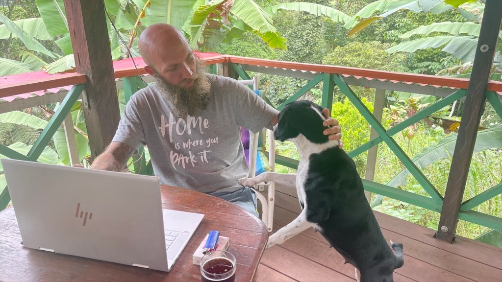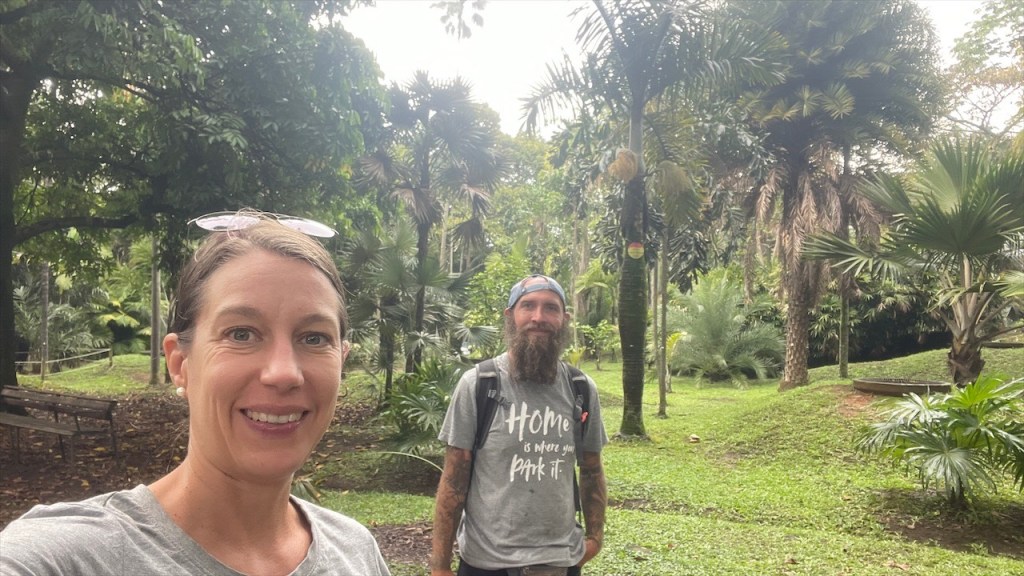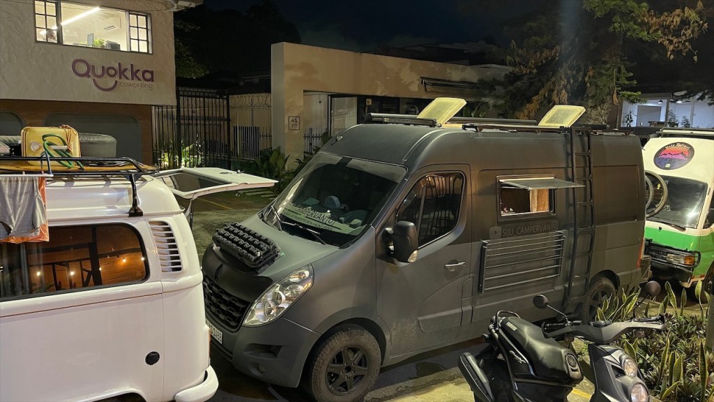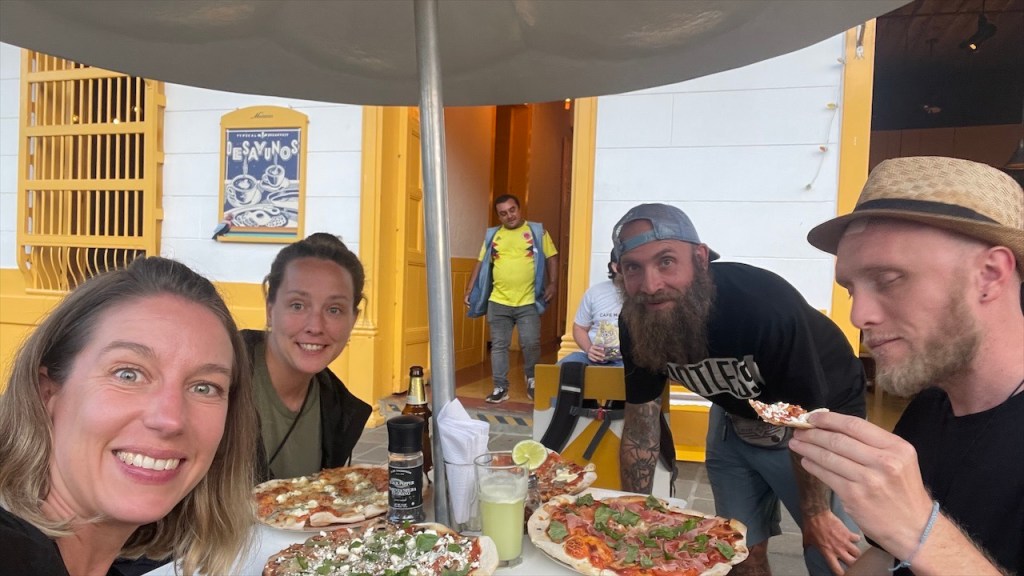 Da unsere Autobatterie seit zwei Tagen beim Start große Schwierigkeiten bereitet machten wir uns am nächsten Tag zuallererst auf die Suche nach einer funktionierenden 220V Steckdose. Die Netzspannung in Kolumbien beträgt 110V aber damit kann unser Ladegerät leider nicht arbeiten. Nach dem Simon alle vorhandenen Steckdosen auf dem Campingplatz getestet und mit dem Messgerät geprüft hatte fanden wir schlussendlich doch noch eine, die die nötige Spannung lieferte. Ob der recovery mode des Batterieladegeräts tatsächlich funktionieren wird bleibt vorerst offen. Falls nicht macht es sicherlich Sinn, dass wir uns noch vor der Verschiffung nach Panama um eine Neue kümmern. 😟 Während Simon sich daran machte, Hängematte und Hängesessel von La Siesta zwischen den Kokosnusspalmen und Mangrovenbäumen anzubringen absolvierte ich eine einstündige, mitunter schweißtreibende Sporteinheit. 🥵 Wobei wir beide, sowohl von der Temperatur in der Nacht als auch am Tag, bis dato noch angenehm überrascht sind. Mit 31°C am Tag sowie 23°C in der Nacht ist es wohl warm aber, zumindest ohne Sonne und mit leichter Brise vom Meer, doch ganz gut erträglich.